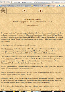 revelação divina, mas apenas como meditações pessoais dessa senhora” Podendo ser lida abaixo em azul com fundo cinza, ou no original... http://www.vatican.va/roman_curia/congregations/cfaith/documents/rc_con_cfaith_doc_19961129_ryden-comunicato_it.html